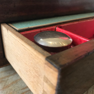 Taking the locking pin out, enables the side drawer with its silver handle to be opened and in this drawer is a writing slope and one of the original silver topped ink bottles.