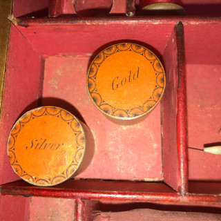 Open the lid to the sewing compartment still retaining its original pink lining paper. Look at the small Tunbridge ware pots with paper labels to their lids with the words silver and gold. These were for storing the precious gold and silver threads in. There is also a multiple reel holder and ribbon reel.